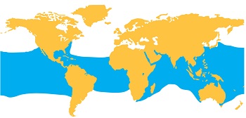 고래상어는 대부분 바닷물의 온도가 높은 지역에서 발견됩니다. 고래상어가 좋아하는 해수 온도는 21~25℃입니다. 인도양에서 많이 발견되지만 몰디브, 탄자니아, 세이셀, 모잠비크, 마다가스카르, 남아프리카 공화국, 호주 등에서도 관찰됩니다. 아래 지도는 고래상어가 출몰하는 지역입니다.