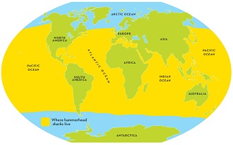 귀상어는 따뜻한 바다 어디서든 관찰됩니다. 아래 지도 중 노란색 부분이 귀상어가 활동하는 곳입니다.